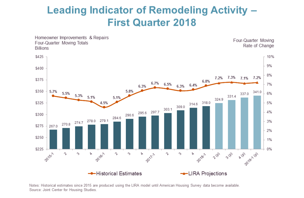 According to the Leading Indicator of Remodeling Activity released by the Remodeling Futures Program at the Joint Center for Housing Studies of Harvard University, Americans' spending on value-adding home improvement and repairs will rise 7.2 percent through March 2019. This totals $341 billion.
